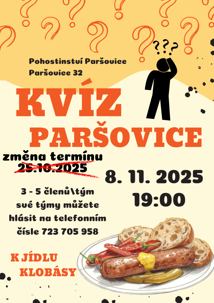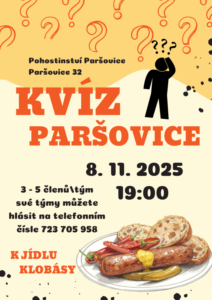 Zveme vás na kvízovou soutěž, která se uskuteční 8. listopadu 2025 od 19:00 (pozor změna původního termínu z 25.10.2025) v Pohostinství v Paršovicích.